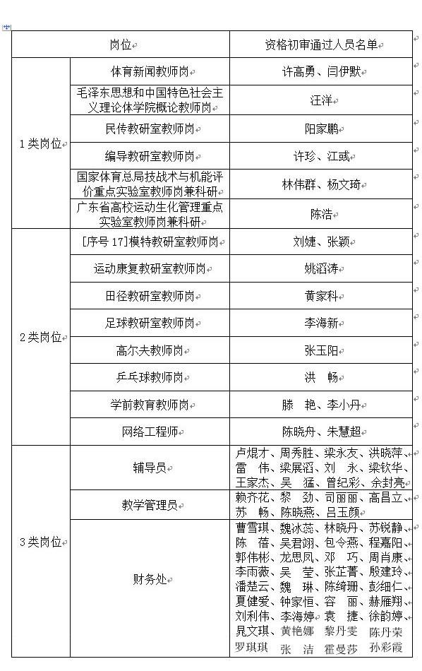 根据《av影片直播-免费成人网 2017年第一批公开招聘事业编制人员公告》,通过对我院2017年第一批公开招聘报名人员网上提供材料进行初审。经审核, 1类岗位(武术历史教师岗、运动训练学教师岗、运动与健康促进重点实验室教师岗兼科研、运动心理学教师岗、运动生理教研室教师岗、计算机教师岗、残疾人运动与健康促进国际协同创新中心教师岗兼科研、全民健身研究中心教师岗兼科研、英语教师岗、高级网络工程师),2类岗位(民传教研室教师岗、排球教研室教师岗、游泳教师岗、篮球教师岗、播音主持教师岗、广电教师岗兼宣传部专技岗、[序号30]模特教师岗、临床医生)等共有18个岗位不符合资格等原因取消考试。现将符合初审资格的岗位和人员名单及资格复审、笔试的有关事项通知如下: